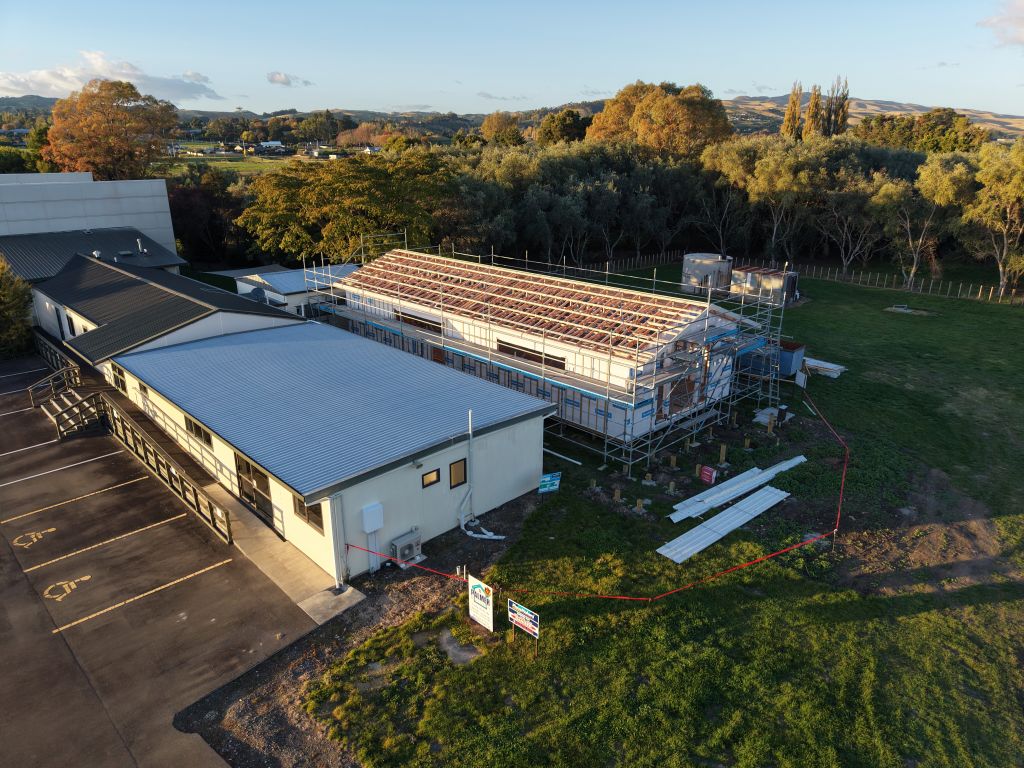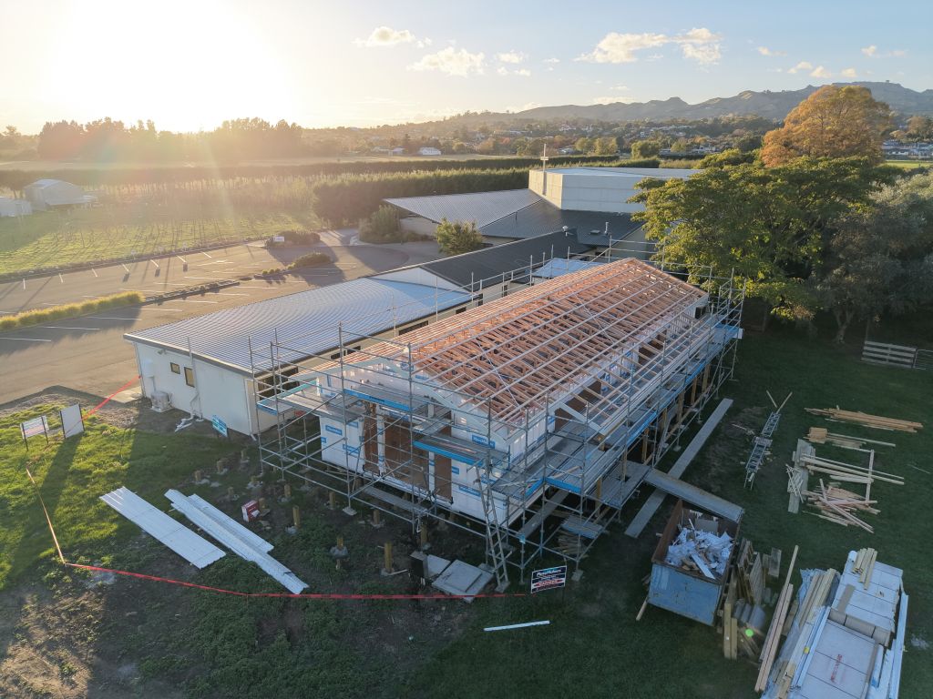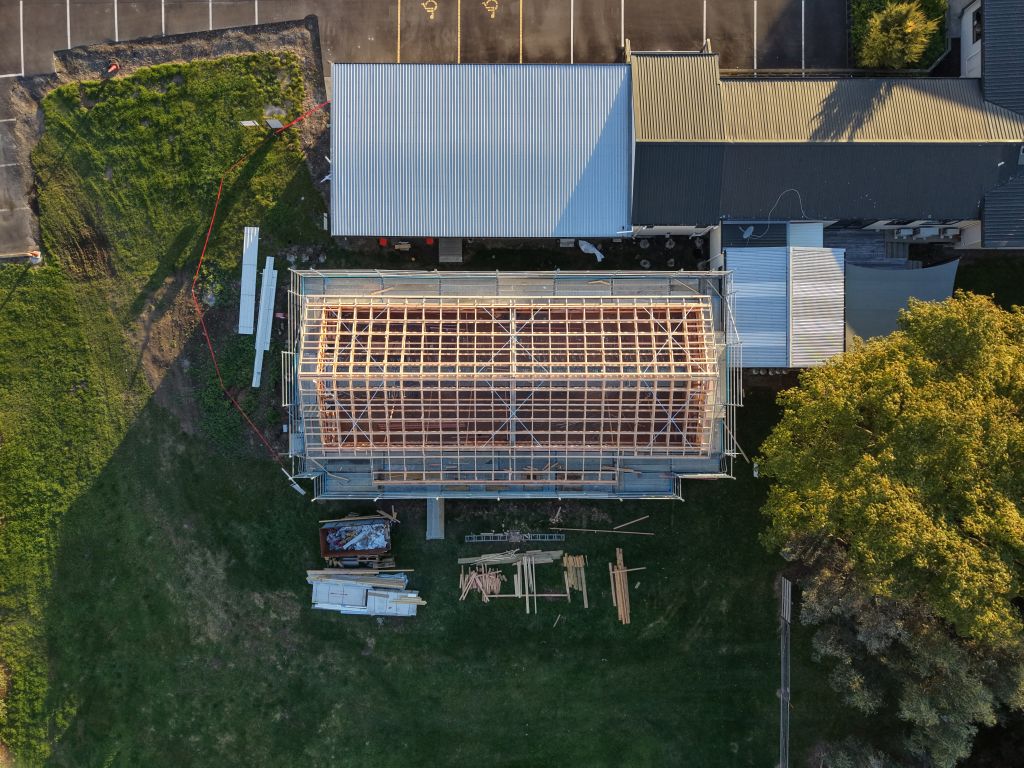 After being delayed due to Cyclone Vaianu, this week has seen significant progress. The building paper has been installed, alongside the cavity battens, and door and window flashings. The cavity battens are designed to create an air gap between the cladding and the building’s structure, allowing any water that penetrates the cladding to drain and air out. The window flashings also serve to protect the framework from water around the windows and doors. But most noticeable is the roof installation. Once this is complete, the internal supports will be removed, allowing us to get an even clearer sense of what the internal space will be like.